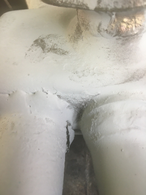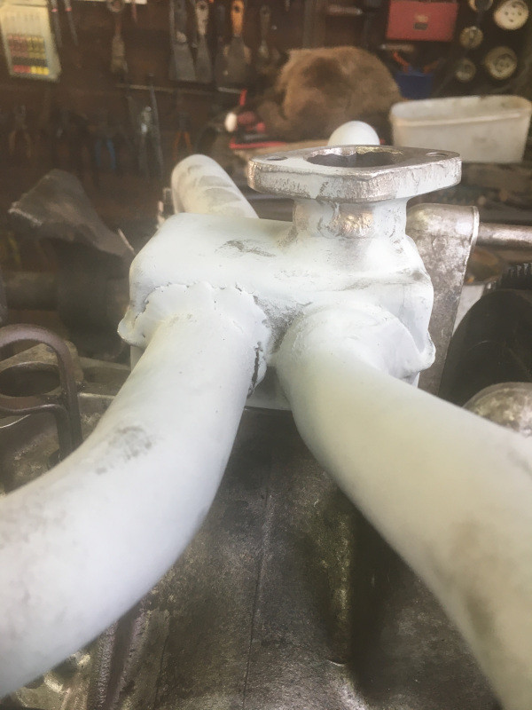 Je suis donc revenu à l'établi, et essayé de souder une tôle de réparation de la sortie du pot de détente. Je précise que le pot est en excellent, à part les trous dus à la corrosion sur le tube de sortie.
