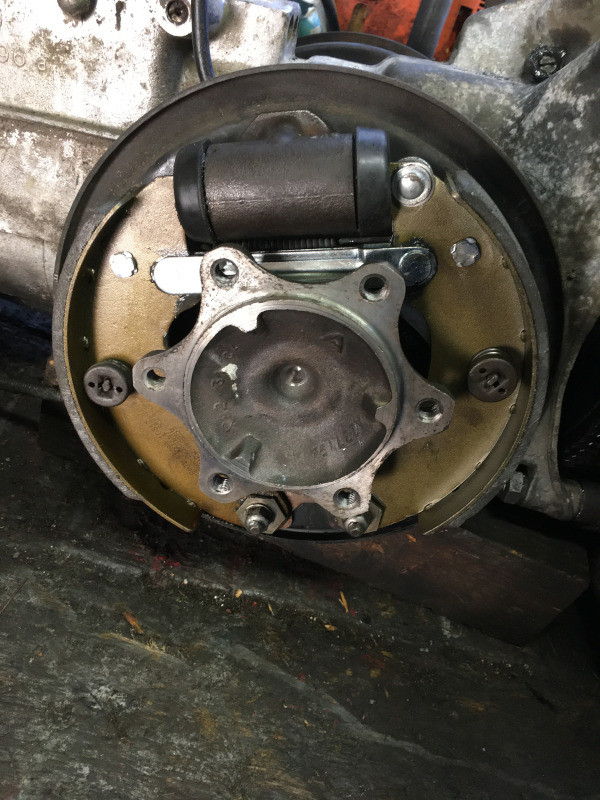 Ce matin, j'ai monté les mâchoires de freins neuves, j'ai reconditionné et posé les cylindres de roues, (présence de rondelles expansives sous les coupelles que je n'avais jamais constatée !), nettoyé et installé les tambours, les transmissions côté boite, posé les tuyauteries et flexible de frein avant.
