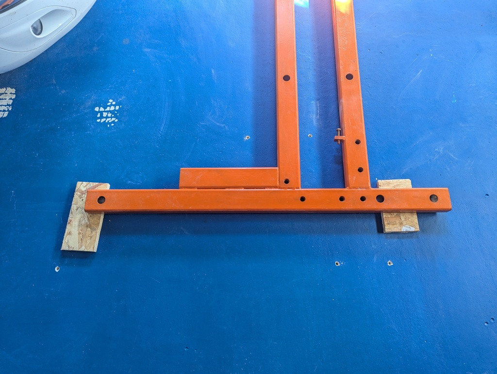 Je fais monter la voiture sur des cales improvisées (des chutes d'OSB) pour la sur-élever de quelques millimètres