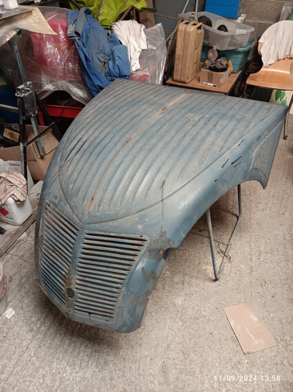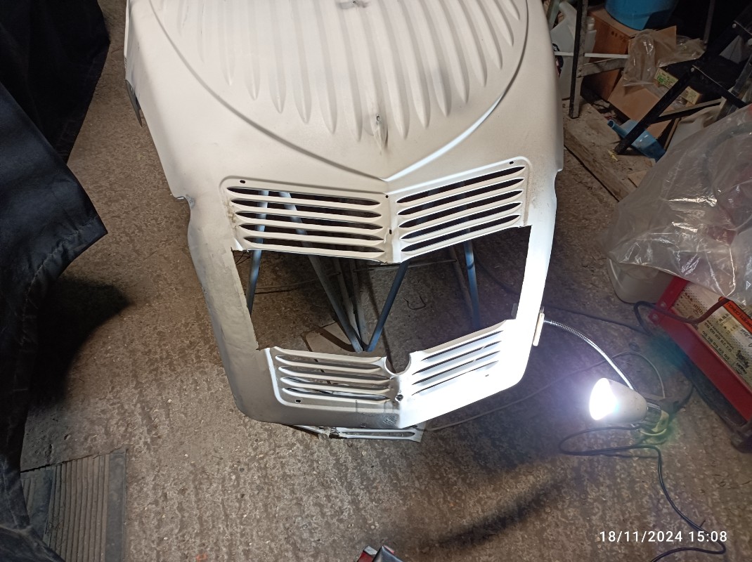 entre temps j'ai sauvé un capot, l'ancien était pourri au niveau de la charnière et du bas capot mais la calandre intacte, le nouveau c'était l'inverse donc j'ai fait une greffe :