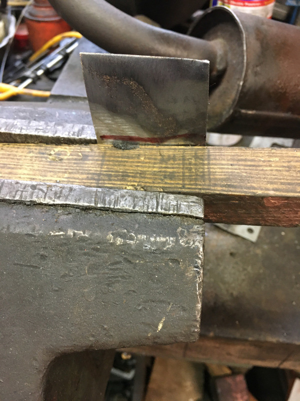 On commence par une tôle à préparer.. Bien sûr, je récupère ;-) Je forme un rebord de tôle, à l'aide d'un carré de bois, dont la hauteur est égale à la hauteur du pli de tôle que je souhaite former : Une fois formée, la tôle se présente mieux : Ensuite, je soude la tôle supplémentaire (j'avais coupé trop court le grand morceau !) Une fois soudée : Je coupe un autre morceau : Je mets l'ensemble en place, avec des pinces : ça avance ! Tout cela n'est pas très joli, mais après réflexion, j'ai fait le choix de souder des morceaux de réparation...