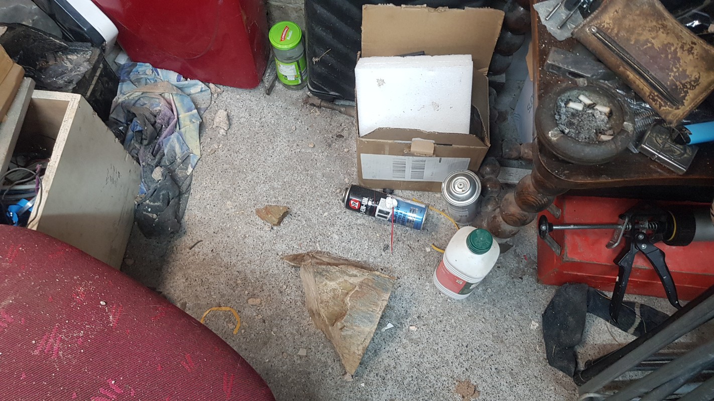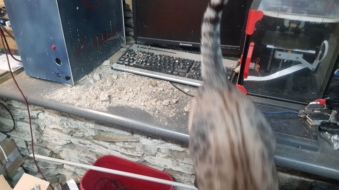 Nos chats prennent un malin plaisir a grimper partout et jetter du gravier, voir meme des pierres de 2 kilos... carrément... sur mon pc dans le garge en passant par ce trou au dessus de mon plan de travail :