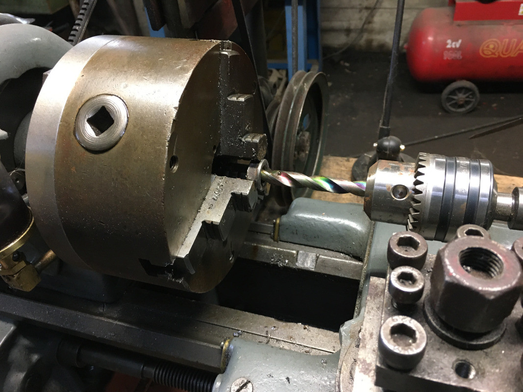 Comme je ne me voyais pas percer à 11 mm avec la sensitive, au centre de la vis cassée, je me suis servi de mon tour à métaux (un ancêtre datant de la Seconde Guerre Mondiale !) Franchement, je me sens plus à l'aise qu'en carrosserie !