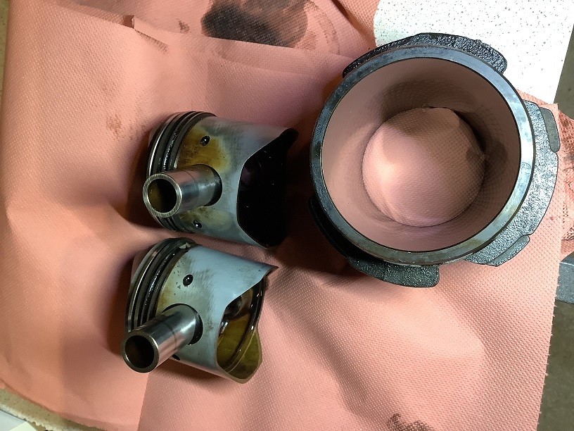 Comme prévu, les pistons sont cuits, deux segments sont cassés sur le piston droit (celui du haut et celui de bas), les deux chambres sont glacées, je viens de commander un kit de deux pistons avec chambres et segments.