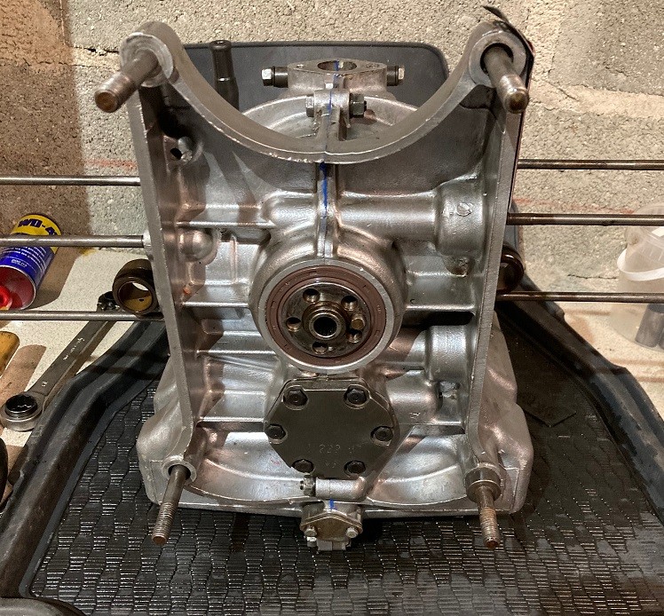 Le nettoyage a été nécessaire, quelques dépôts sans gravités, brosse nylon sur perceuse pour l'extérieur et le plan de joint (ça n'use pas l'aluminium), de la loctite sur le plan de joint en petite quantité, mais rien sur la pompe à huile ni sur la crépine (comme à l'origine, mise en place des deux joints spis, celui côté dynamo était mort !.