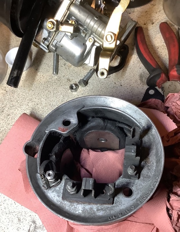 Le remontage a bien continué ce week-end, vérifications pour le radiateur d'huile et les conduites, puis la pose. Nettoyage de la dynamo, j'ai utilisé du nettoyant contact électrique, ça élimine bien le gras rien qu'avec le jet, essuyage très léger pour ne pas abimer les bobines. j'ai bien retiré le gras qu'il y avait sur les entrefers du stator, ça devait coller avec le rotor, j'ai peut-être gagné quelques chevaux...