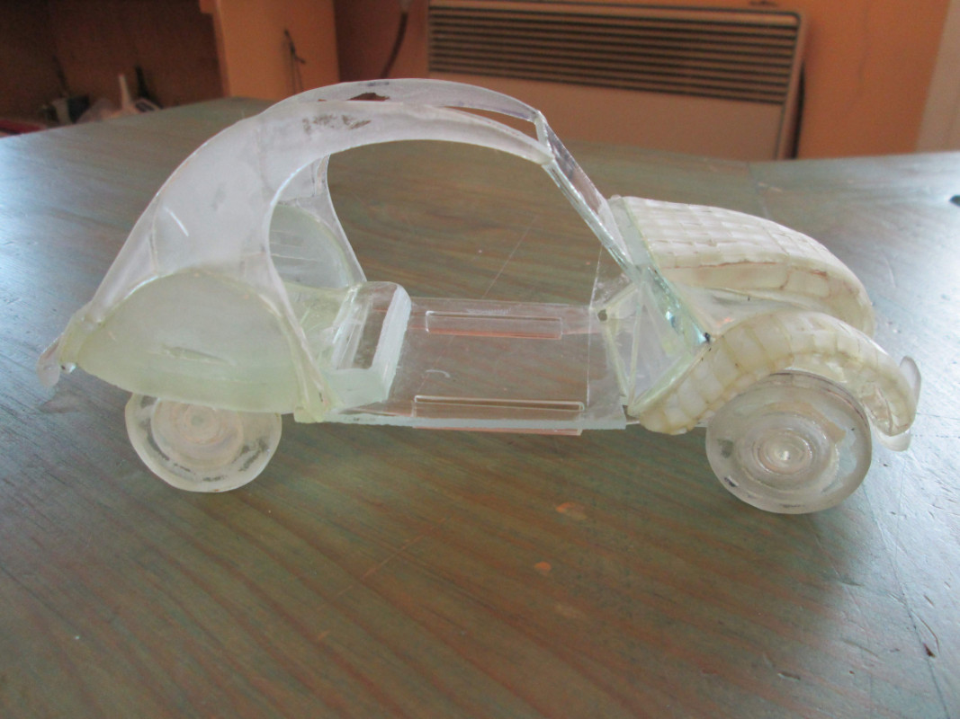 J'ai 4 photos de toutes la collection de voiture que j'ai fait. Sur ces photos, la 4cv était en cours de fabrication. C'est la maquette la plus réussie parce que tout fonctionne, portes, capot, il y a le moteur et tout les éléments dans le coffre avant