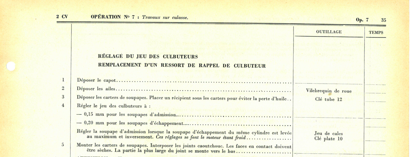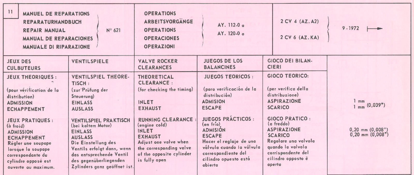 Le jeu "aux soupapes", pour un moteur de 2cv4, comme de 2cv6, est de 0,20 mm, ECH & ADM, à froid.