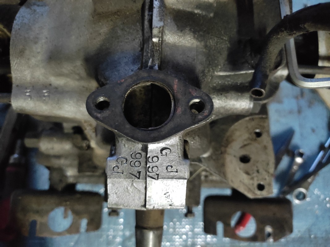 J'ai ouvert le couvercle de ma boîte, ça a pas l'air plutôt bien à l'intérieur., ce qui confirme ce que m'a dit le vendeur, son beau père avait voulu une boîte à disque et avait fait procéder au changement ce qui explique aussi que j'ai récupéré le levier de frein à main fixé au châssis. J'ai commencé le démontage du moteur sans difficulté, je compte l'ouvrir c'était un peu boueux dans les cache culbuteurs, je n' avait pas ouvert le précédent je n'étais pas assez sûr de moi. Il y au niveau du reniflard je pense le numéro d'appairage avec des initiales peut être celles de l'usineur ou simplement elles font partie du code ? Bonne fin de week-end