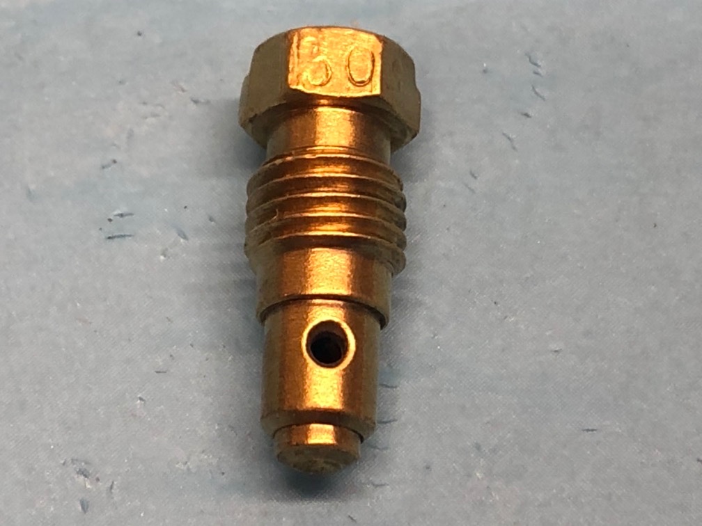 Sur la face avant, tu as le gicleur de ralenti (c'est lui qui assure le mélange de l'air qui arrive par le dessus et l'essence qui arrive par son extrémité, le mélange ainsi créé partant vers le bas.) :