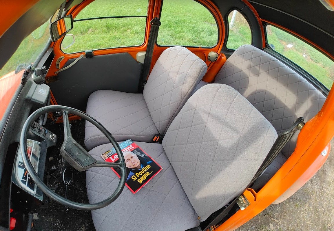 Au niveau de la couleur de la 2CV, sa couleur d’origine était sûrement le Beige Colorado. Je m’en suis rendu compte en regardant certaines parties non repeintes (mais non visible de l’extérieur) – par contre, impossible d’en être sûr puisque le code couleur a été repeint. La personne à qui je l’ai achetée l’avait repeinte entièrement après la restauration de toute la carosserie, avec le Orange Ténéré. Malheureusement, cette couleur n’étant pas disponible en 1982. Tant pis, elle me plait bien dans cette couleur donc j’ai décidé de la laisser avec cette couleur (et surtout, je n’ai pas envie de me lancer dans ce chantier !). Pour le choix de l’intérieur, j’ai cherché une couleur neutre qui irait bien avec le Orange Ténéré. Initialement, les fauteuils étaient en rayé beige. J’ai donc choisi le gris tissu que l’on retrouve dans les 2CV Charleston.