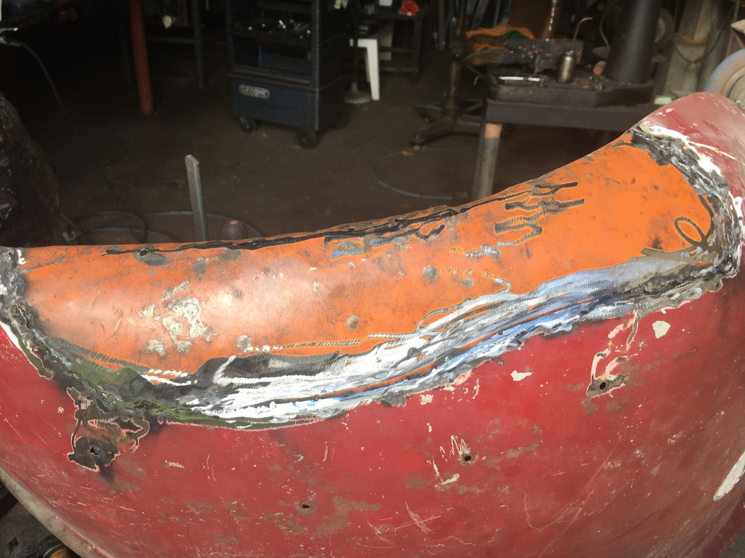 Après réflexion, je pense que je vais meuler toutes ces horreurs (la tôle de réparation ne jouxte pas bien les bords découpés de l'aile) et je ferai les finitions à l'étain.