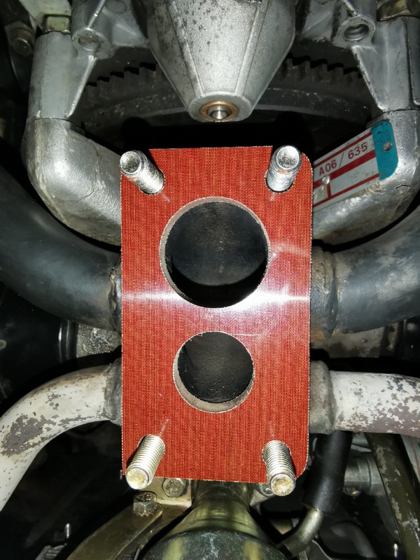 - la même cale thermique est en sandwich entre deux joints papier neufs et j’ai préalablement pris la précaution de frotter à la toile èmeri fine + nettoyage le plan de joint rectangulaire de pipe d’admission.