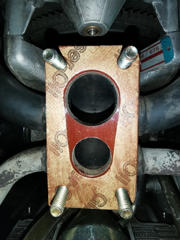 Et ensuite remontage sur la 2pattes : 1 joint graissé puis la cale thermique puis de nouveau un joint graissé et le carbu par la dessus !