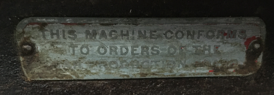 Mon tour a une plaque ""This Machine Conforms to the Orders of the War Production Board" (Conseil de production de guerre)