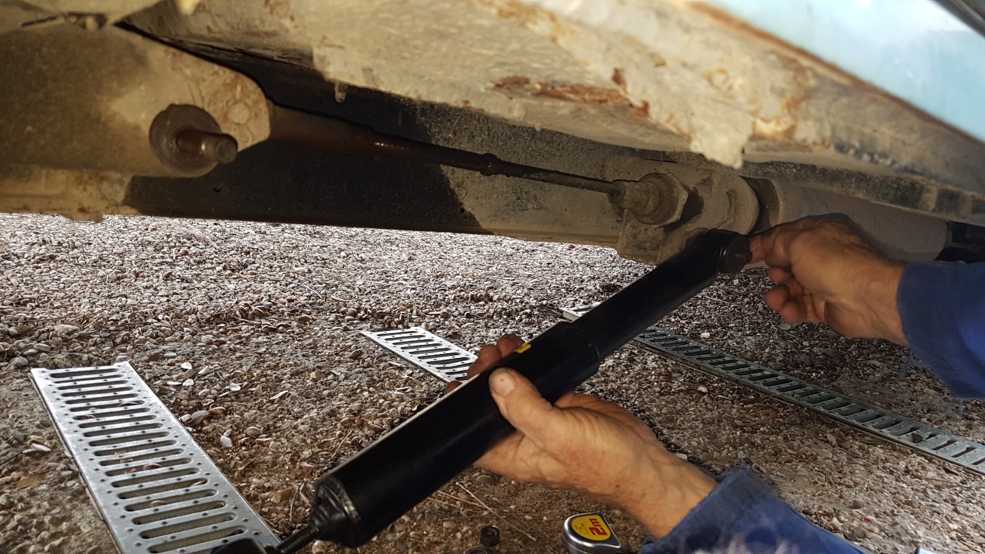 Ca permet de détendre le pot de suspension pour que ça soit moins dur à dévisser. Pour prendre la mesure, on redescend la voiture.