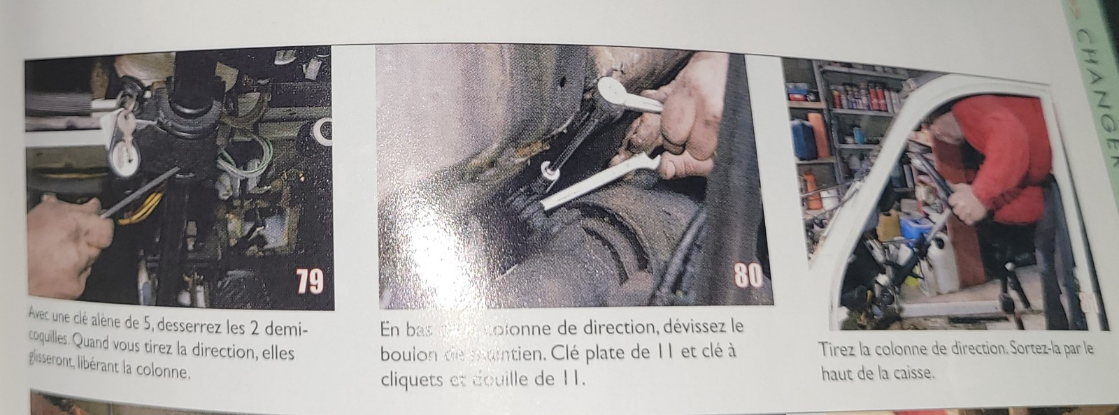 Bjr bon et bien après plusieur tentatives pour retirer la colonne de direction en tapant sous le volant rien on m'a prêté un chasse rotule a frappé sa ressemble a l'outil vendu pour sa a juste éclater le bas de la colonne la ou c'est fendu au bout d'une semaine yen a marre je les tronçonner :(