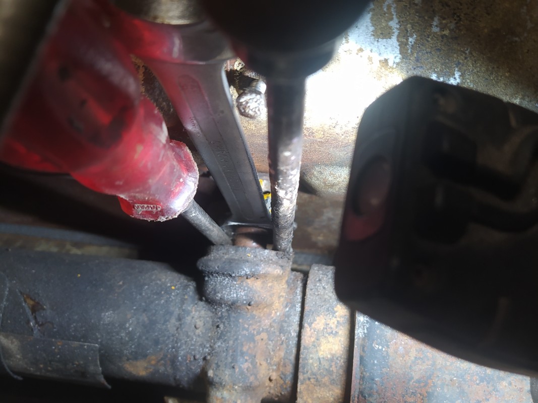 :megaphone: NOOONNN essaye de faire levier au niveau de la crémaillère (enlève bien le boulon je vois pas sur la photo) et quelqu'un qui hoche le volant comme on dit chez moi (de haut en bas)