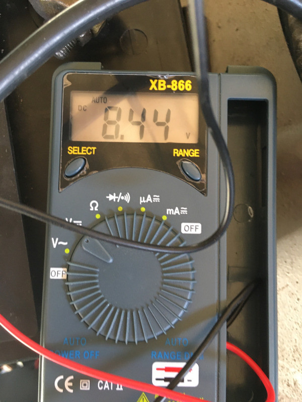 Vue de l'arrière : La sellerie en place : Ensuite, j'ai contrôlé de nouveau la tension de la batterie. Cette fois, pour un affichage plus pratique, j'ai employé un voltmètre numérique (alors que je suis plutôt analogique, d'habitude