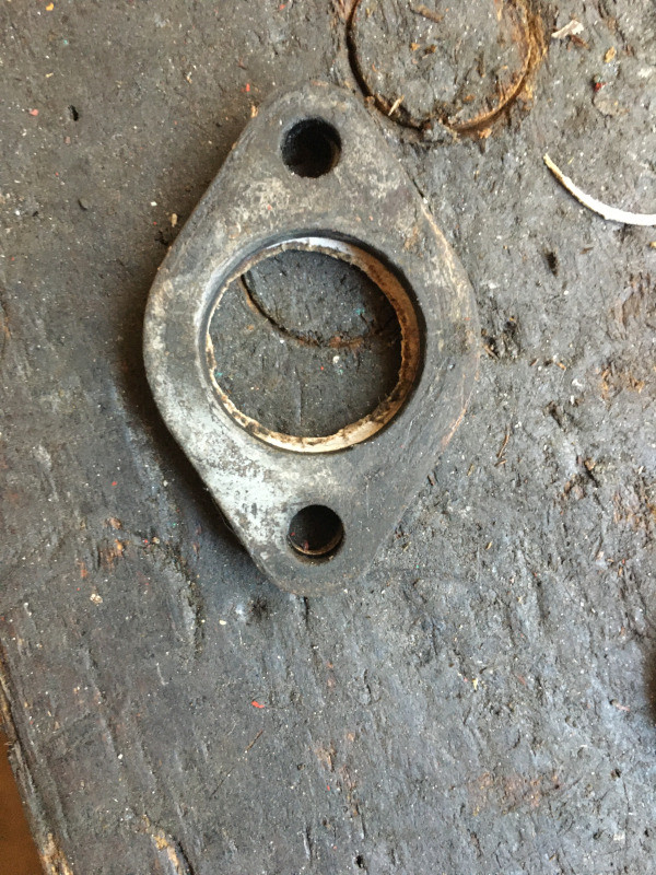 Comme la tubulure d'échappement était fendue, j'en ai profité pour la démonter afin de pouvoir la souder au semi-automatique : Une fois soudé : Ensuite, contrairement au montage d'origine, j'ai ajouté des joints entre la cale pare-chaleur et la tubulure et entre le carburateur et la cale pare-chaleur.
