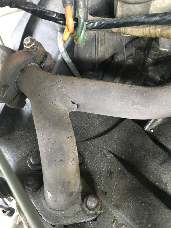 Bon, encore du travail en perspective, la tubulure d'échappement est fendue ! Cette fissure est apparue après l'échauffement de la tubulure, malgré le serrage de ses écrous au couple...
