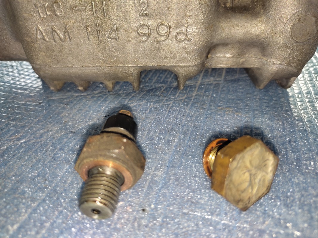 J'avais remarqué une grosse vis sur le côté du raccord du radiateur d'huile qui ne semblait pas d'origine, j'ai pas plus cherché mais en faisant le tour de sites de vendeurs de pièces je m'aperçois que c'est l'emplacement du manocontact de pression d'huile qui a été enlevé et remplacé par cette vis, j'espère qu'il n'y a pas une surprise dans le filetage, je vais essayer avec un ancien que j'avais gardé.