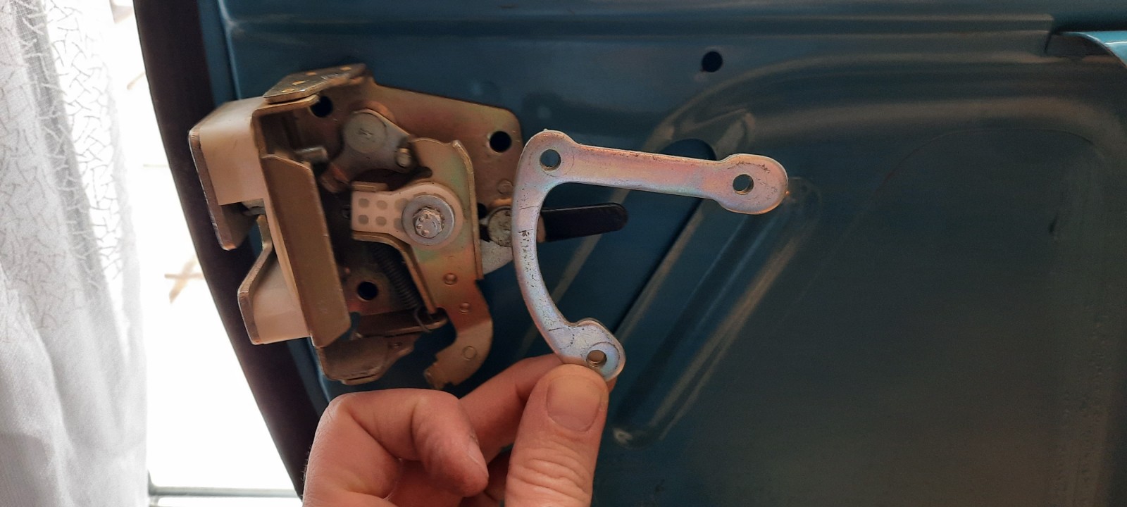 J'ai repris les côtes pour le replacer au même endroit quand tout sera repeint. J'ai aussi désossé les 4 portes pour les préparer au poncage et à la peinture, il ne me reste que les 2 vitres arrières à déposer avec leur joint. Il faut juste faire attention à ne pas faire tomber la platine qui tient la serrure quand on dépose le tout