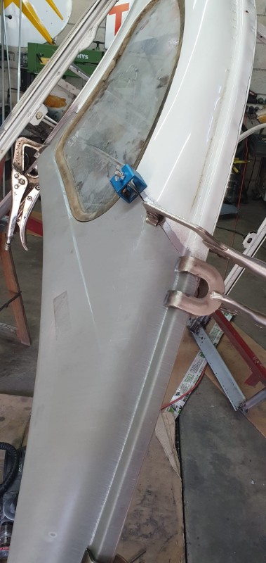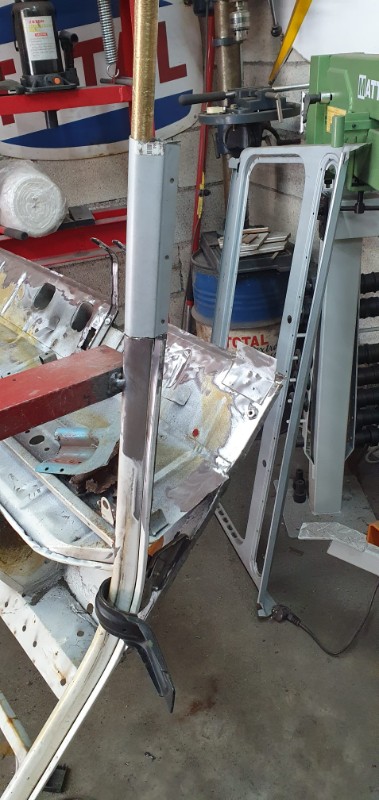 Devant, le pieds A a été également 'rabouté' et le profil de gouttière changé par une version conforme (pas si facile à trouver : bonne largeur d'appuis sur caisse et bonne profondeur) : reste à le tronconner à la forme du bas de caisse :