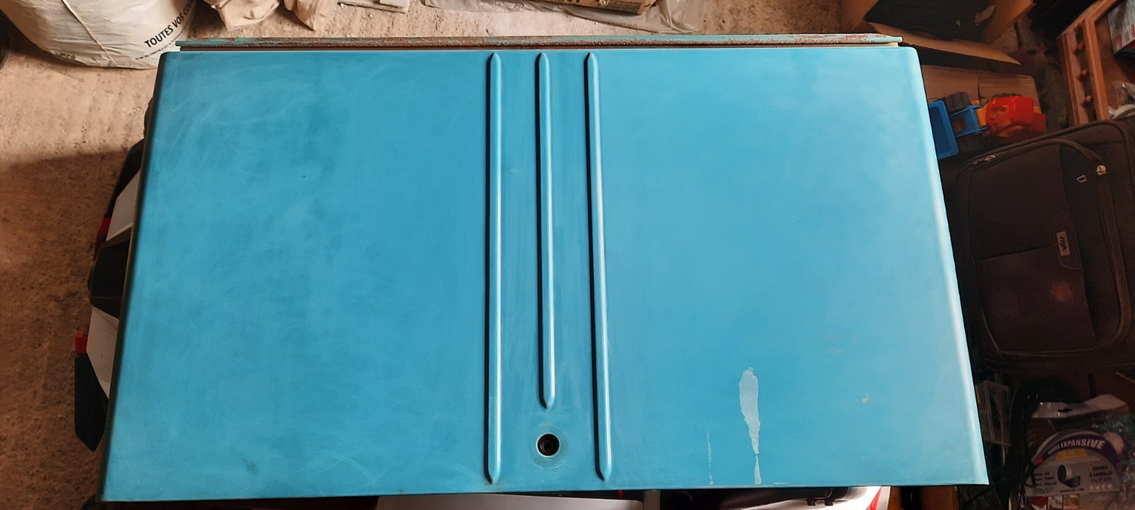Je l'ai décapé et remis le metal à nu avant de l'apprêter et de le peindre, il y avait de la rouille sous la peinture d'origine : Le résultat final avec un nouvel autocollant :