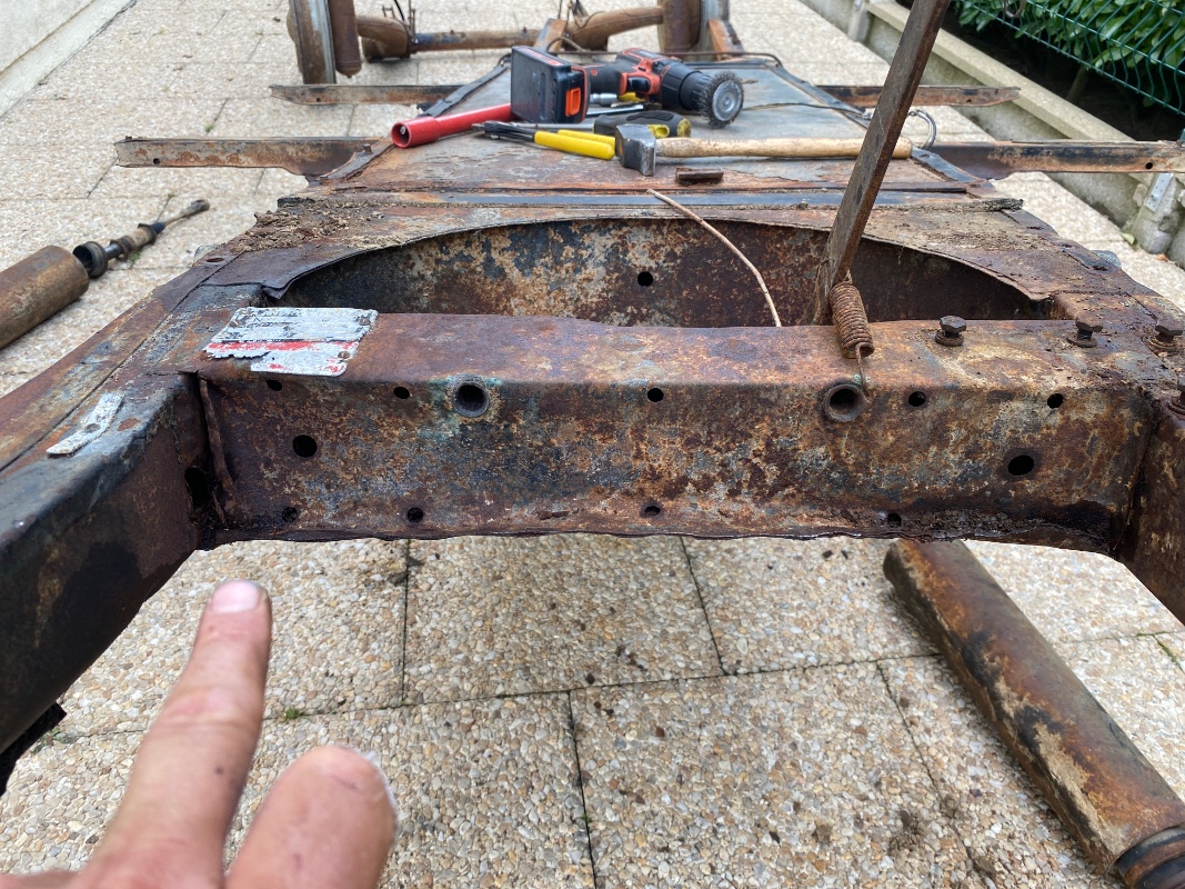 J'ai procédé ainsi : dépose du groupe moto-propulseur, de la carrosserie, des trains roulants afin de déshabiller totalement la plateforme, et la contrôler. Celle des 2CV de ces années était solide, sans doute fabriquée avec des tôles plus épaisses que les plus récentes, mais la rouille aura certainement fait des dégâts.