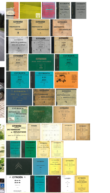 je suis à la recherche d'un catalogue de pièces détachées pour 2cv6 comme dans mon temps ancien les microfiches. pourquoi cette demande car je suis en train de remonter une 2cv6 charleston de j'ai acheté. elle est démontée et j'essaye de la restaurer mais voila il y a des pièces que je ne retrouve pas leur emplacement y compris celles qui manquent. j'ai une Panhard 17b de 65 et sur le forum panhard on a un un catalogue pièces détachées qui montre l'emplacement des pièces avec visserie et autres, ce qui ma bien aider pour la remise en état. j'ai fouillé sur le net mais rien. si quelqu'un peut me dire ça m'arrangerais et m'éviterais de faire et défaire, même si !!!.