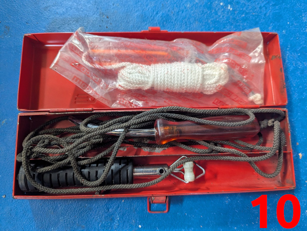 10 = ? poignée + tube courbé creux avec une ficelle qui passe à travers ; en haut le même outil neuf non déballé