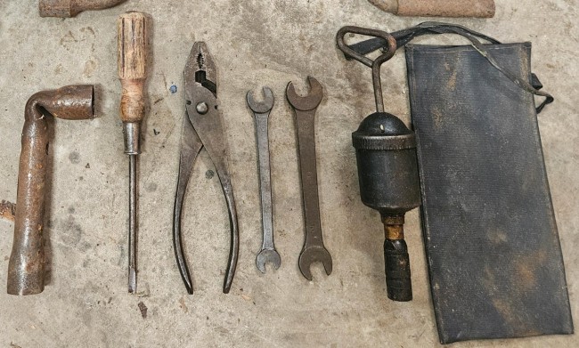 Autre lot de bord complet (photo de O) qui devrait être de vers 55. La clef à bougie est coudée emboutie, la pince est une United U. Le tournevis est à virole longue.la trousse, tissu enduit , est avec coutures parallèles