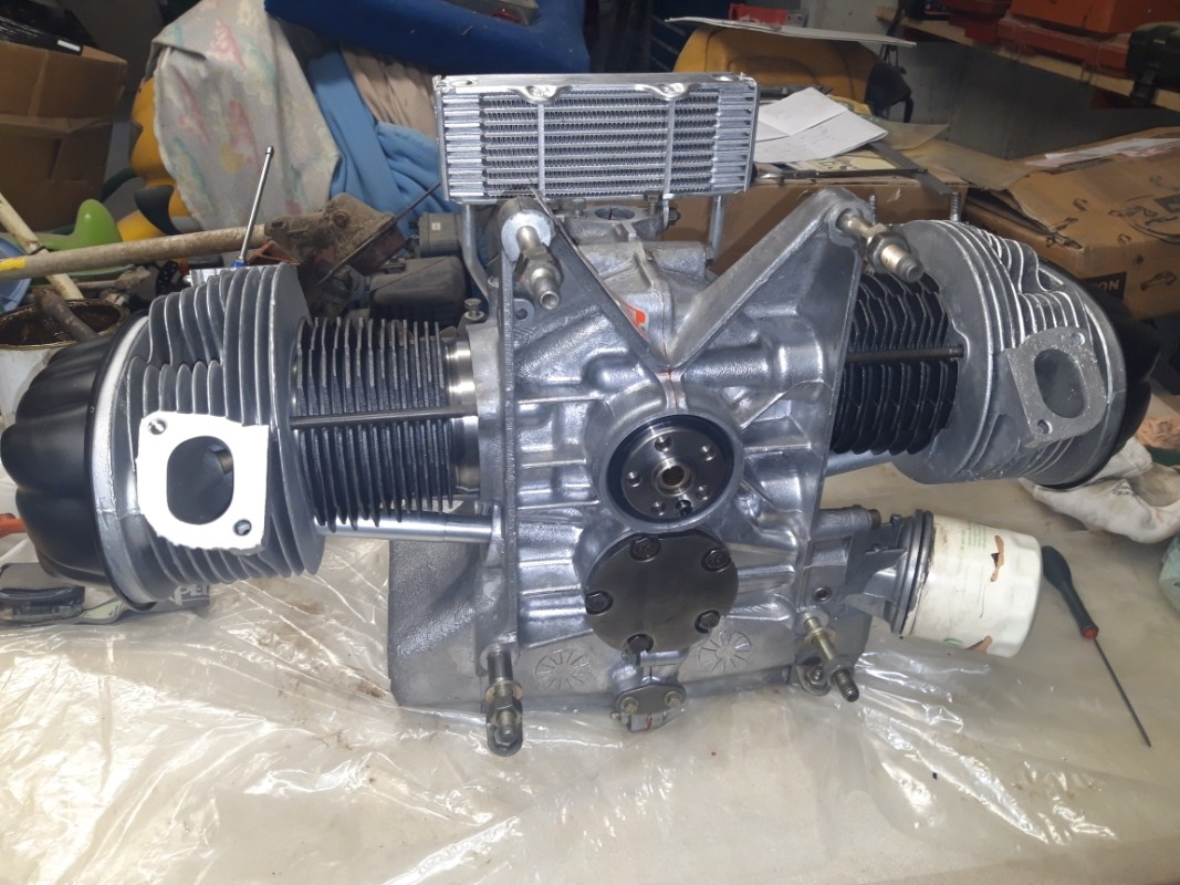 montage des chemises et des pistons, reniflard neuf, caches culbuteurs repeints, jauge à huile, présentation des culasses refaites à neuf,