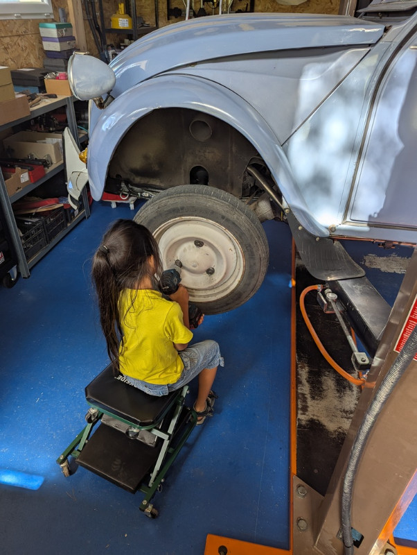 La roue est un peu lourde pour elle, alors c'est moi qui la pose au sol.