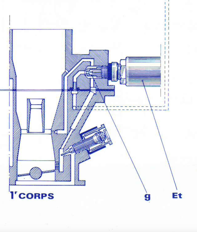 Car tu y retrouves la prise d'air pour le circuit de ralenti (flèche bleue) et comme nous sommes sur un carburateur monojet, le trou de non-renversement ! (flèche rouge) !