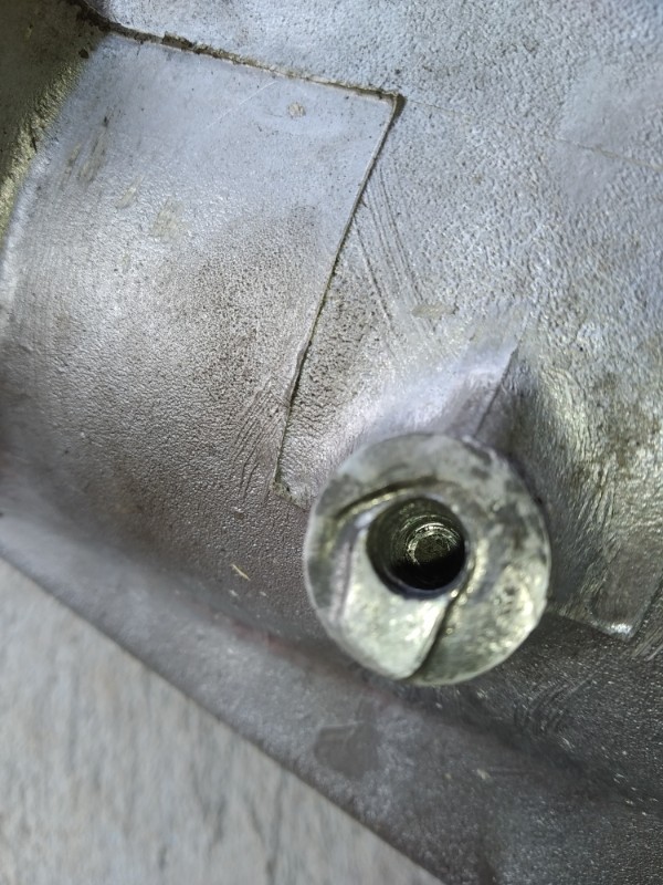 L'ancien carter a bien les deux mêmes numéros mais il a un petit problème sur l'une des fixations du pot d'échappement sous moteur. La vis a dû casser lors d'un démontage. Une tentative de perçage a été faite mais pas exactement sur la vis restante (partie couleur rouille).