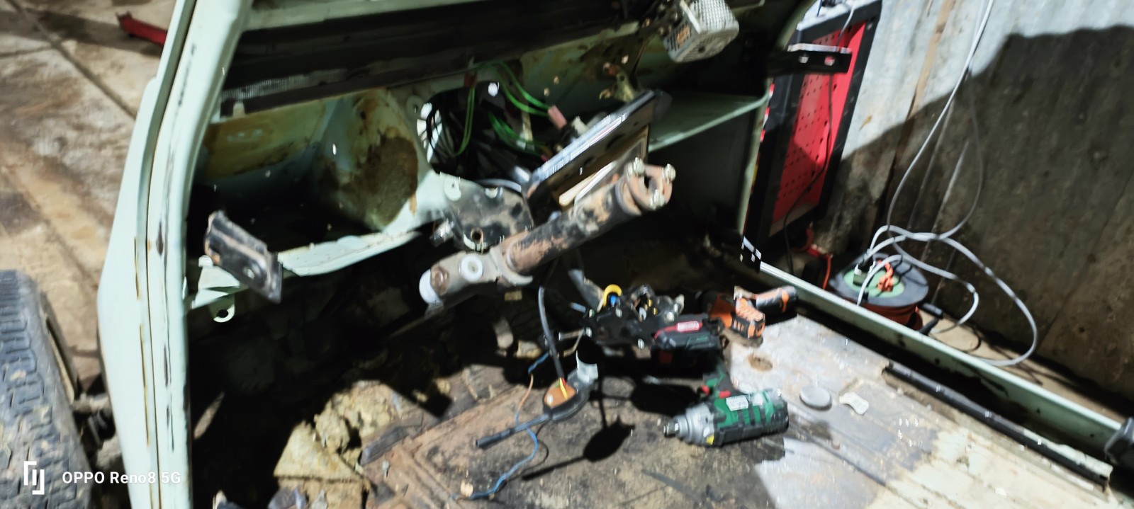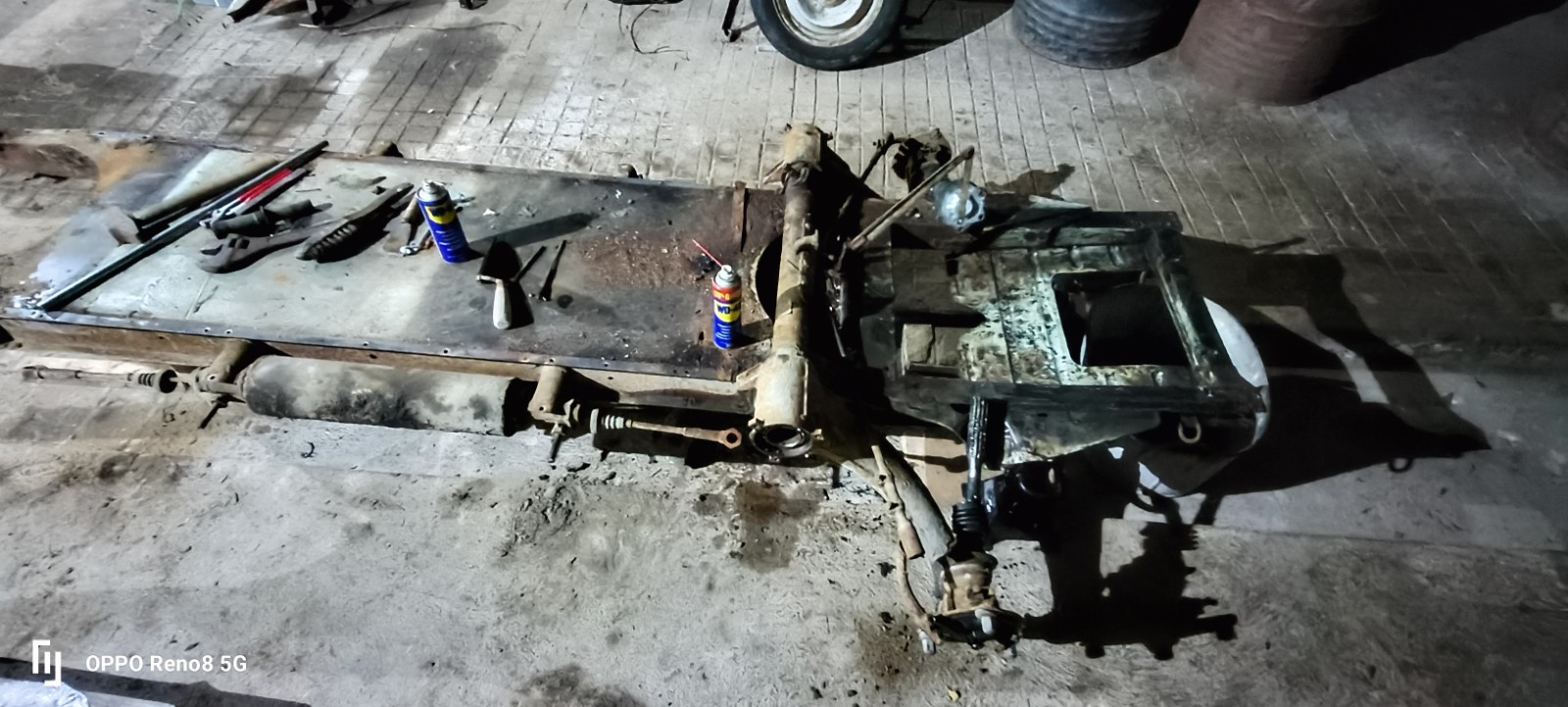 Le Châssis : A ce stade le châssis parait être en état, mais il faudra surement lui faire un coup de jeune, nettoyage, sablage ou ponçage, puis un traitement antirouille et anti gravillons sera nécessaire. Les amortisseurs et surpension seront remplacé pour partir sur une base saine, le circuit de freinage sera aussi refait. Les essieux seront révisés.