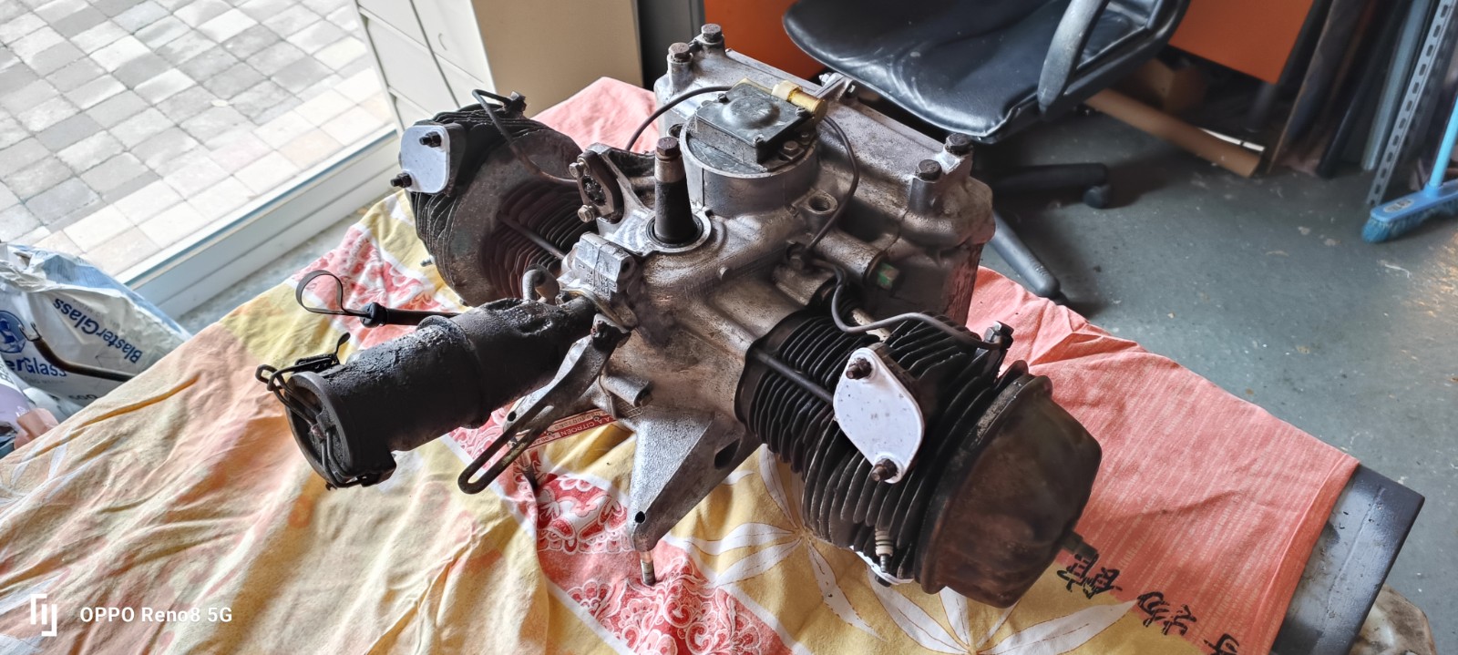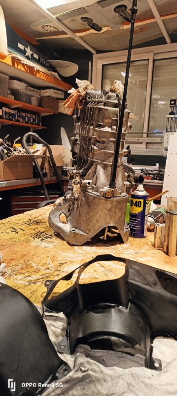 Le moteur est arrivé sur l'établi, j'ai opté pour un démontage nettoyage, j'aurai pu donner un grand coup de nettoyeur haute pression avec dégraissant, mais ne connaissant pas le moteur, j'ai préféré le faire progressivement.