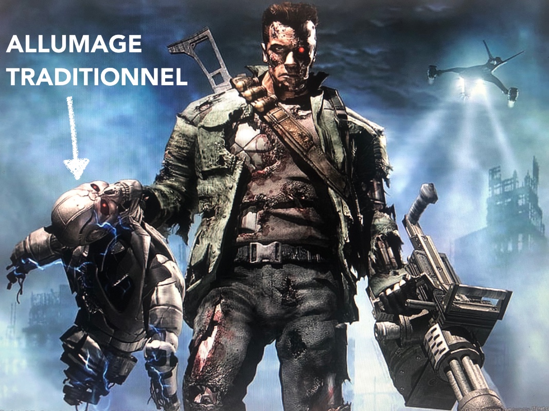 J'aime bien le Terminator qui tient un robot bourré d'électronique sans ses jambes, sensé représenter l'allumage vis platinées...