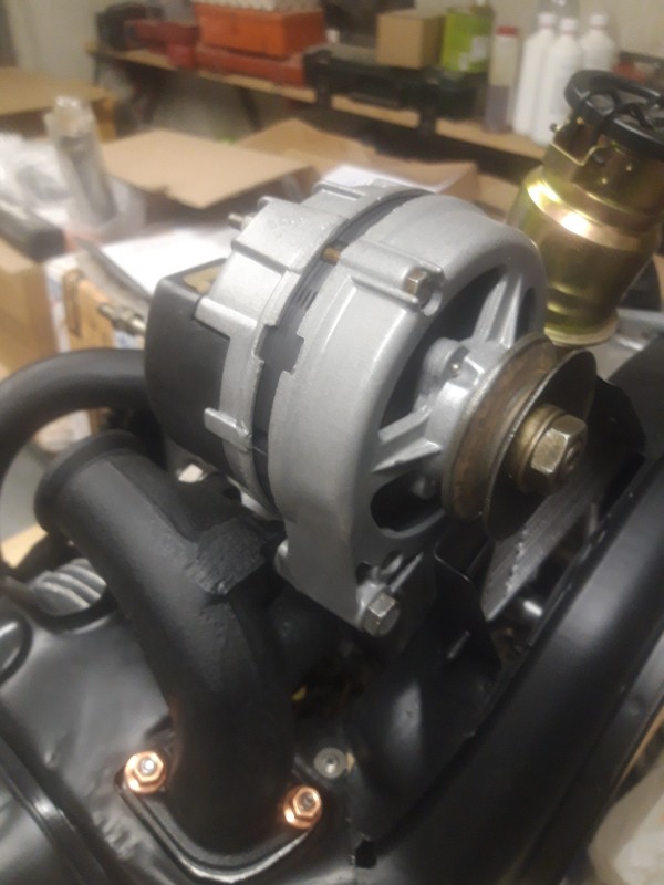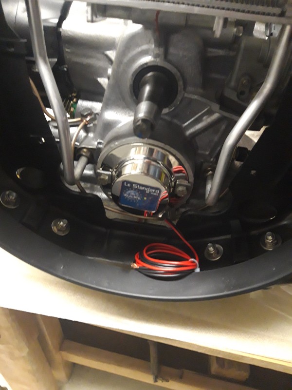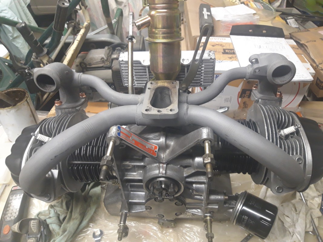 montage des chemises et des pistons, reniflard neuf, caches culbuteurs repeints, jauge à huile, présentation des culasses refaites à neuf,