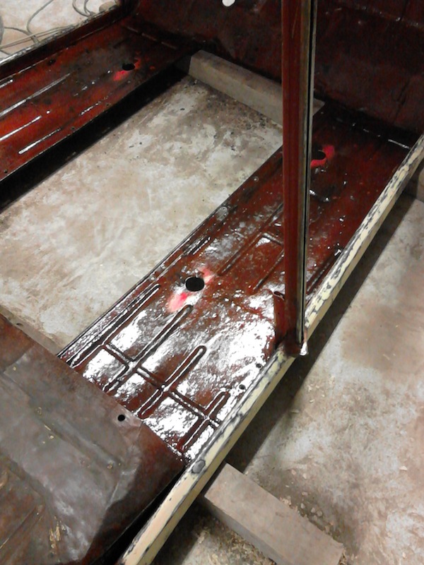 Le châssis, a été blacksonné ( :cry: :cry: ) ça l'a protégé extérieurement, mais j'espère qu'il n'y a pas eu d'infiltrations d'eau :| . les longerons eux ne présentent qu'une légère couche de rouille superficielle (heureusement).
