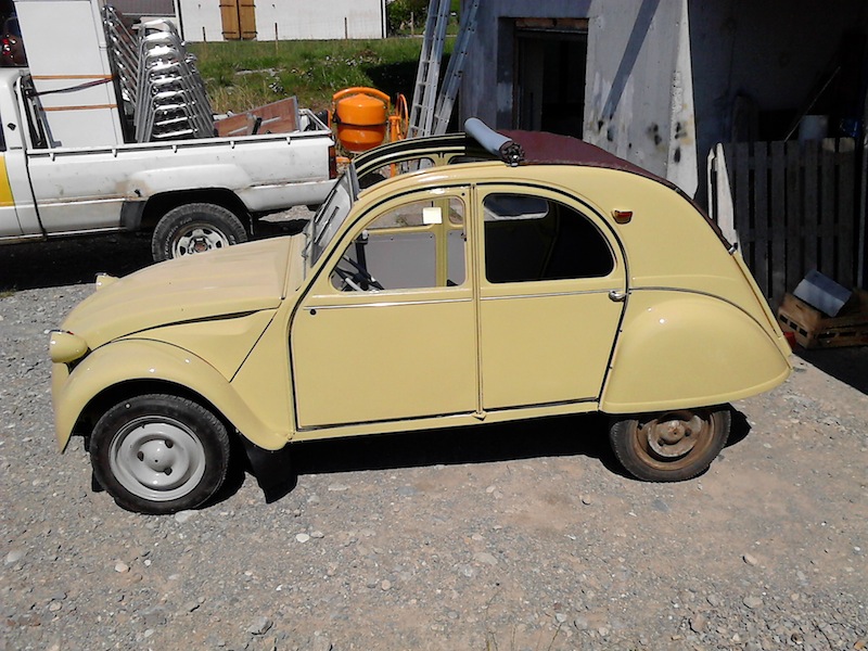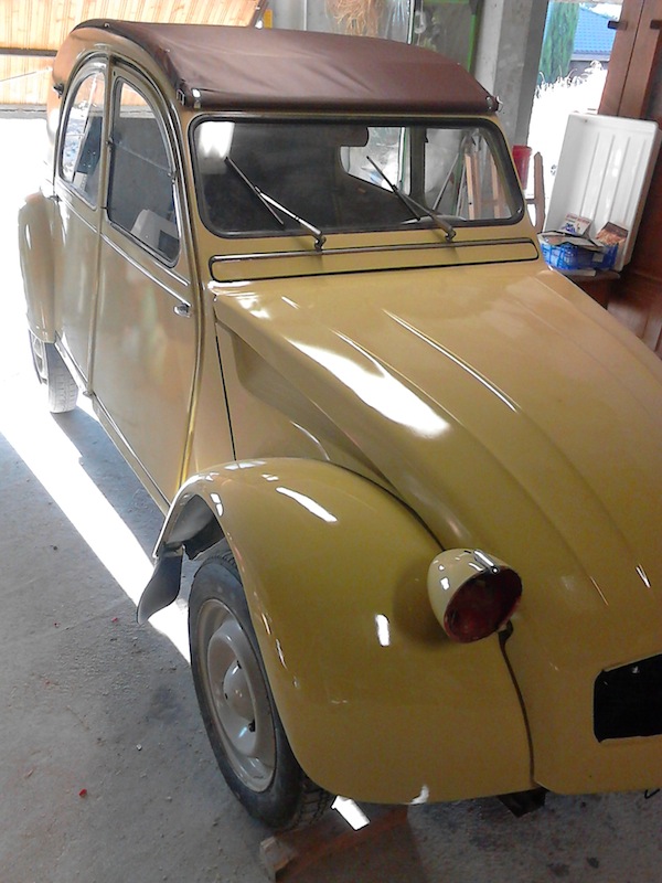 Photos de la 2cv après les 3 couches de peinture noire antirouille: