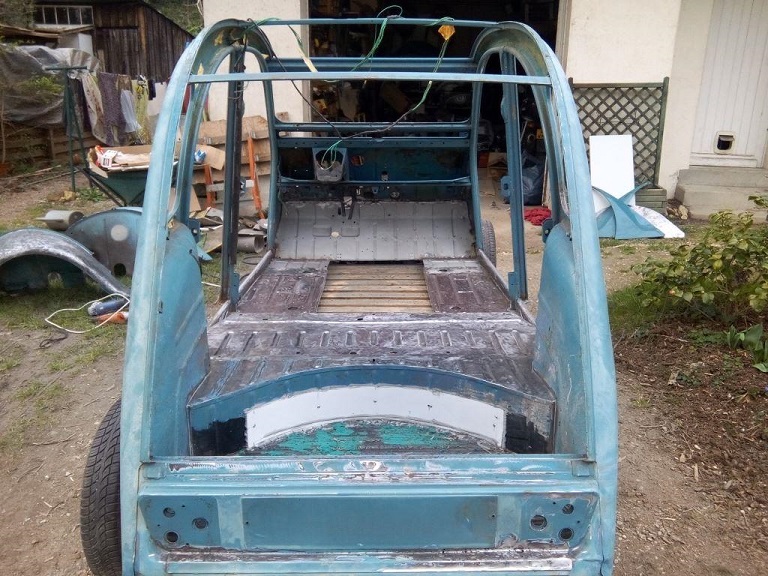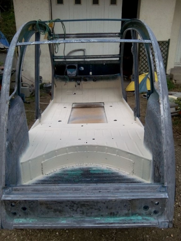 Il y a eu de la soudure, du décapage, du martelage,du masticage, du ponçage, du masticage, du ponçage [prendre les deux derniers mots et les répéter Ad Libitum] :D; de la peinture, de l'assemblage, de la sellerie (moquette au sol et sur les côté, isolant thermique et phonique dans les portières et réfection des panneaux de porte, fabrication d'un plancher de coffre et d'un panneau pour la porte de coffre) pose d'un allumage électronique, d'un lave-glace électrique ((en promo à 15 € sur un site web siégeant à Amboise), des diodes pour remplacer les voyants et les ampoules veilleuses et stop : les codes/phares sont en H4.