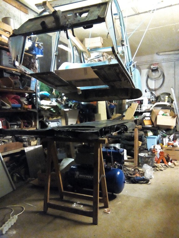 Il y a eu de la soudure, du décapage, du martelage,du masticage, du ponçage, du masticage, du ponçage [prendre les deux derniers mots et les répéter Ad Libitum] :D; de la peinture, de l'assemblage, de la sellerie (moquette au sol et sur les côté, isolant thermique et phonique dans les portières et réfection des panneaux de porte, fabrication d'un plancher de coffre et d'un panneau pour la porte de coffre) pose d'un allumage électronique, d'un lave-glace électrique ((en promo à 15 € sur un site web siégeant à Amboise), des diodes pour remplacer les voyants et les ampoules veilleuses et stop : les codes/phares sont en H4.