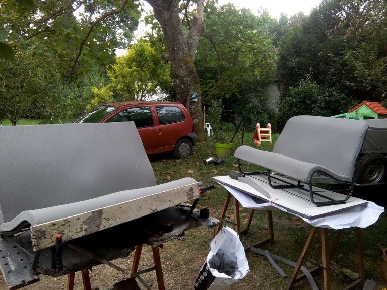 Les sièges finalement ont été refaits. J'ai durci un peu les assises avec du sandow (diamètre 8mm) et un sellier de la Ville Aux Dames m'a fait un bon prix sur de la mousse (c'était la fin du rouleau).