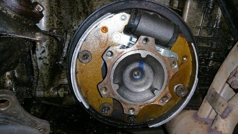 Les garnitures sont en très bon état, je détends le frein à main, agis sur les deux vis de 14 de rattrapage pour que les mâchoires soient le plus rentrées possible.