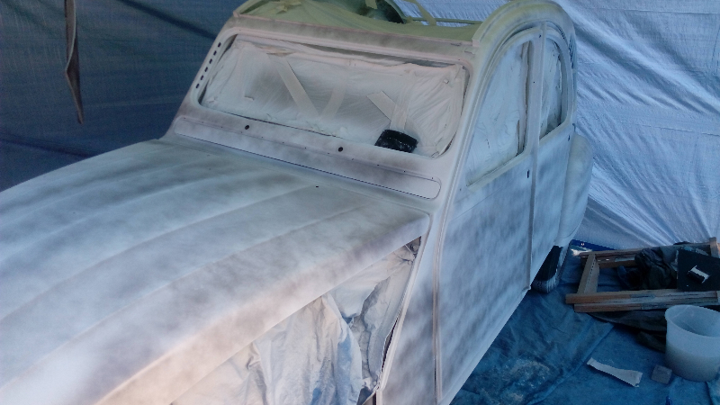 ensuite je passe a l'apprêtage complet de la carrosserie avec un apprêt dit "poursuite" qui permet de passer couche sur couche sans attendre le séchage complet , l'avantage est que l'ont peut charger le produit sans avec de coulure et de masquer le maximum de défauts ( j'ai passé 3 couche "couche sur couche " )