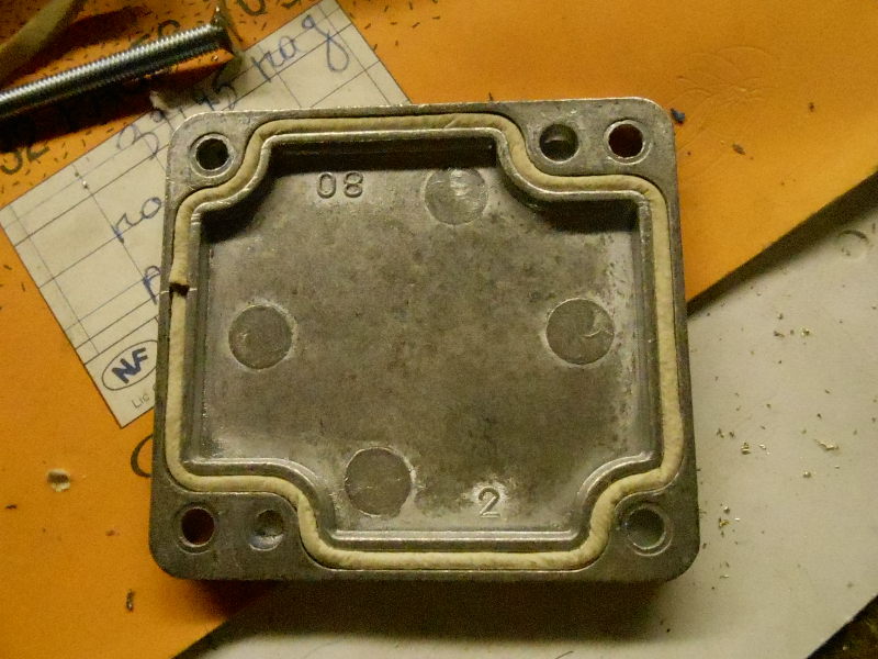 le circuit imprime a du etre poncé avec précaution car il ne passait pas il y a un joint a mettre sur le couvercle puis j'ai monté l'ensemble sur une plaque galva riveté sur le tablier j'ai mis a la masse le condensateur et le fil noir de l'allumage electronique