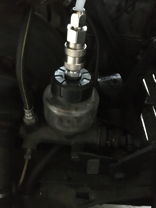 J'ai pensé que celui-ci serait plus pratique, car plus léger et autonome... Et le pire, c'est que le bouchon vendu avec l'appareil, bouchon dit "universel", se visse en lieu et place du bouchon d'origine sur le réservoir en verre de la 2CV : Quand je refais entièrement un système de freinage, comme celui-ci, j'aime toujours détecter les fuites éventuelles avant de purger avec du liquide de freins.